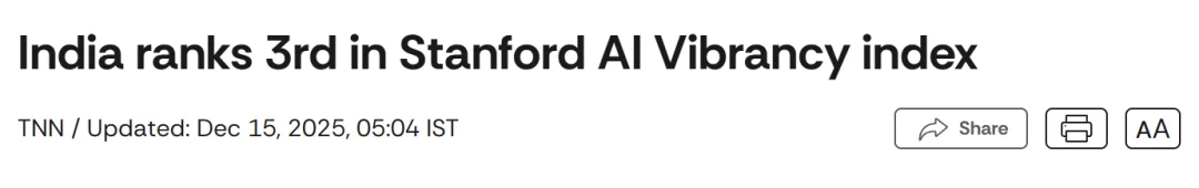 说个魔幻的现实,前两天,斯坦福发布了《AI 活力指数》。这榜单看得人直迷糊,印度的 AI 竞争力居然干翻了英日韩,仅次于美中,一屁股坐到了全球第三。。