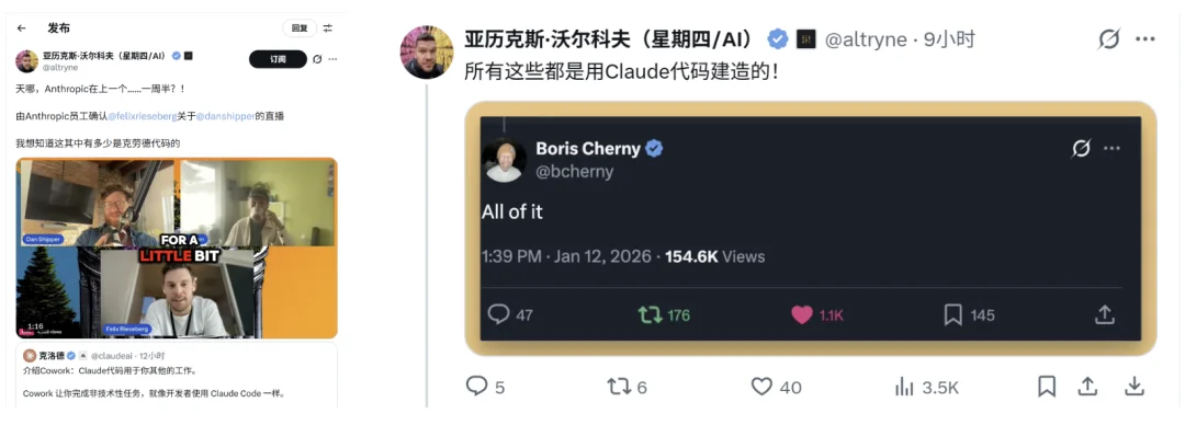 Claude code 之父甚至出来爆料,Cowork 的代码 100% 都是由 Claude Code 敲出来的。。。
