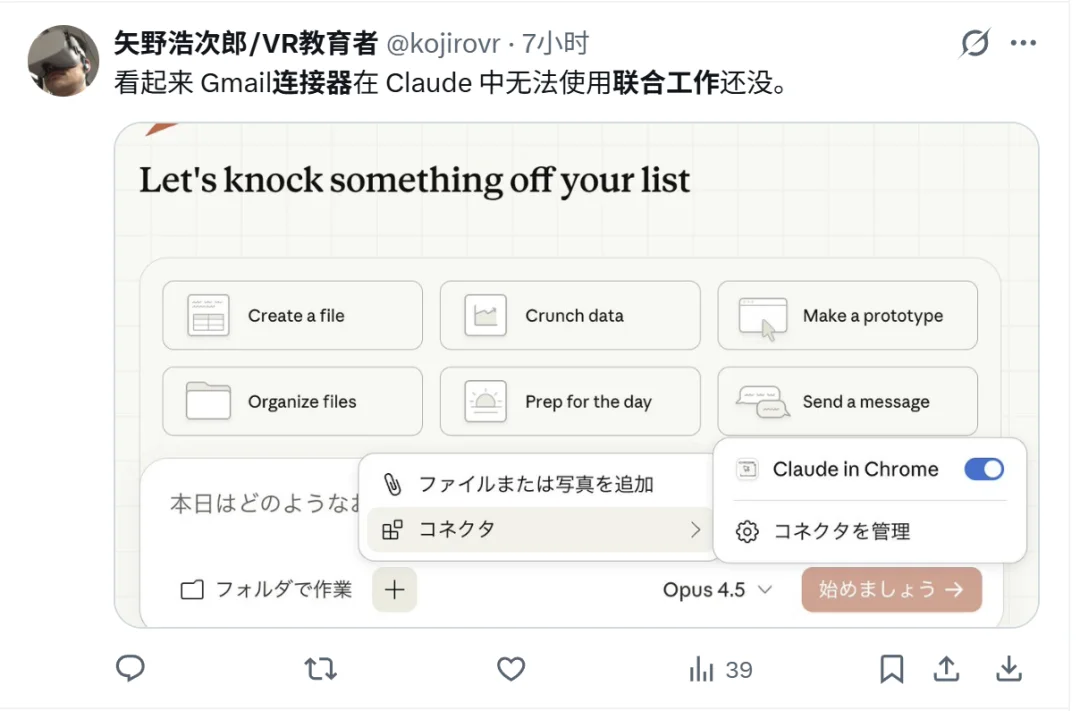 Claude 允许你可以使用你现有的连接器(Connectors)来获取外部信息,比如可以接入 Chrome 浏览器,完成完成需要访问浏览器的任务。