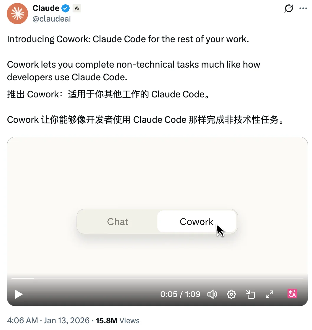 Anthropic发布 Cowork,给普通人用的Claude  Code