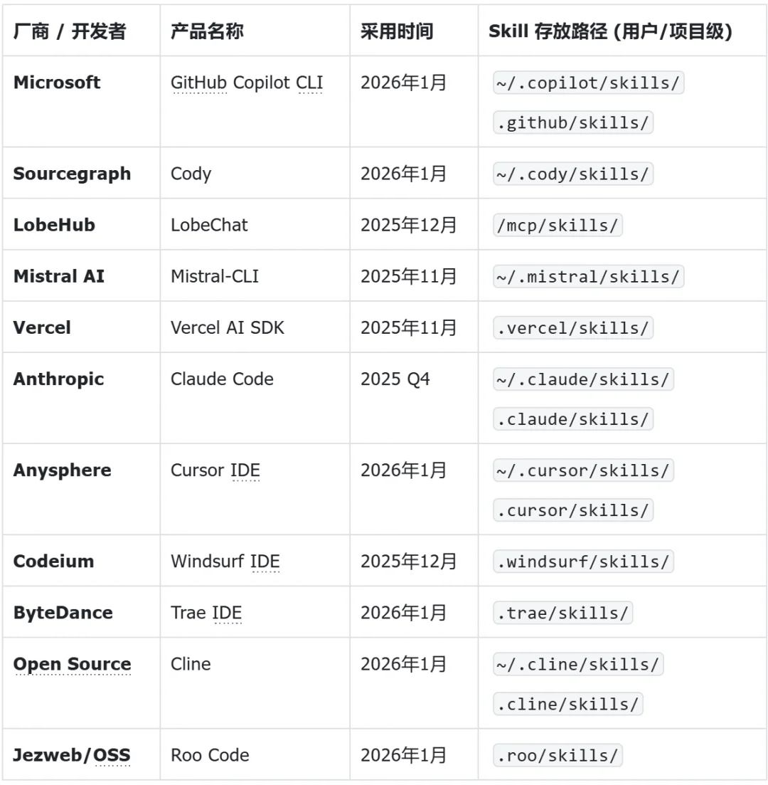 但问题在于,过去这些东西几乎都是平台私有的,你换一个 IDE、换一个 CLI、换一个 Agent 框架,经验积累就要重来。现在不同了。