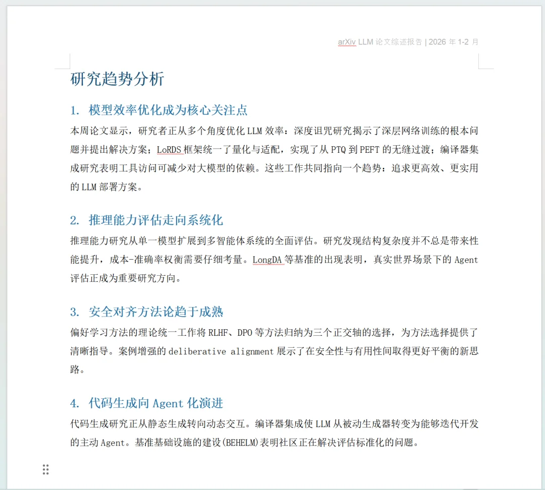 下载 arXiv 上最近 7 天的”Large Language Model”相关论文,提取每篇的标题、摘要、核心结论、实验数据,按研究方向分类,生成一份综述报告。