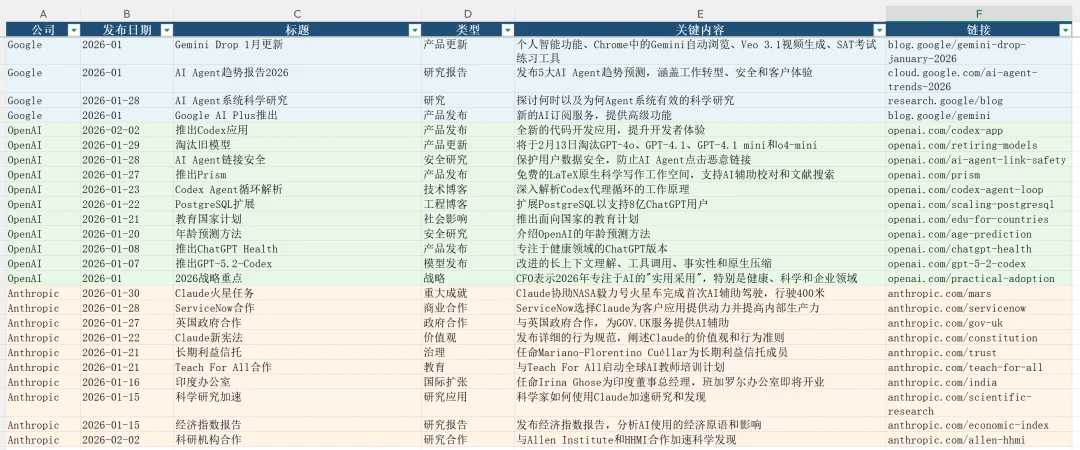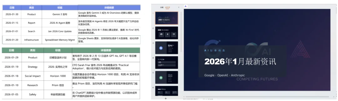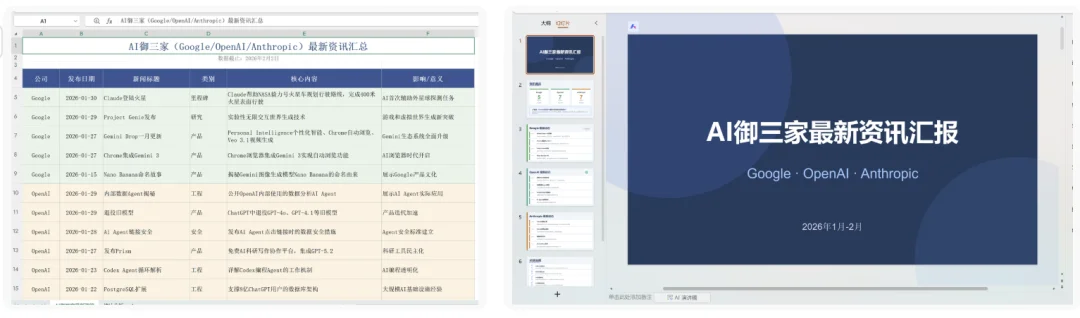 从御三家(Google/OpenAI/Anthropic)的博客提取最新资讯,生成 Excel 表格和 PPT 汇报材料。