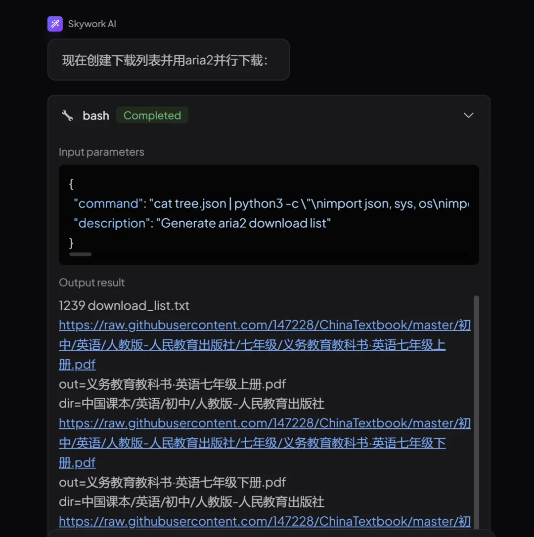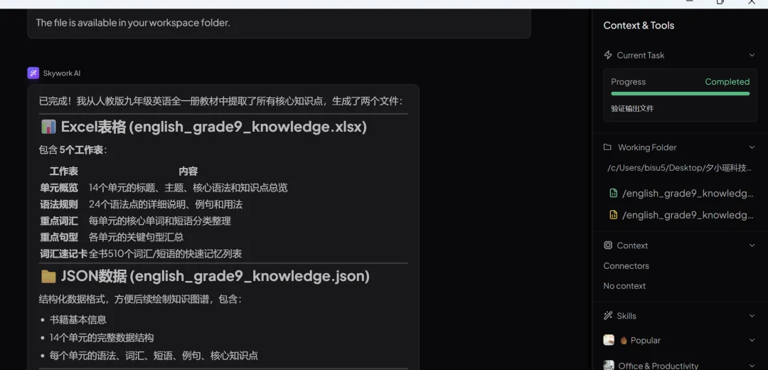 看来,Skywork 不仅理解 PDF 结构,还能识别出章节、知识点、例句、词汇表,把它们结构化提取。既然单个文件处理效果这么好,那批量处理呢?
