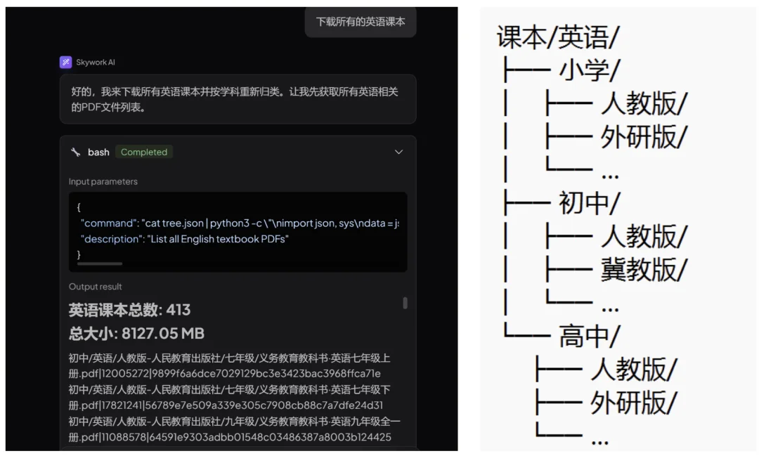 它立即调整策略,开始自动分析文件树结构,提取出 413 个英语 PDF 文件(8GB)。然后创建了分类目录:课本/英语/小学、课本/英语/初中、课本/英语/高中。