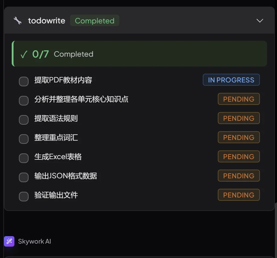 Skywork 先是把任务拆分成了七个步骤:提取教材内容、整理知识点、提取语法点、整理重点词汇、生成表格、json 文件,输出。