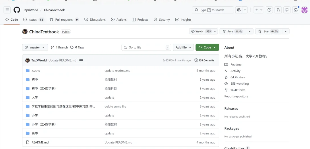 这个仓库很多课本,涵盖小学、初中、高中、大学的所有学科教材。但我试了好几次都没下载成功,要么速度太慢(点开一个个 PDF 手动下载???),要么直接失败,也不知道是网络问题还是文件太大。