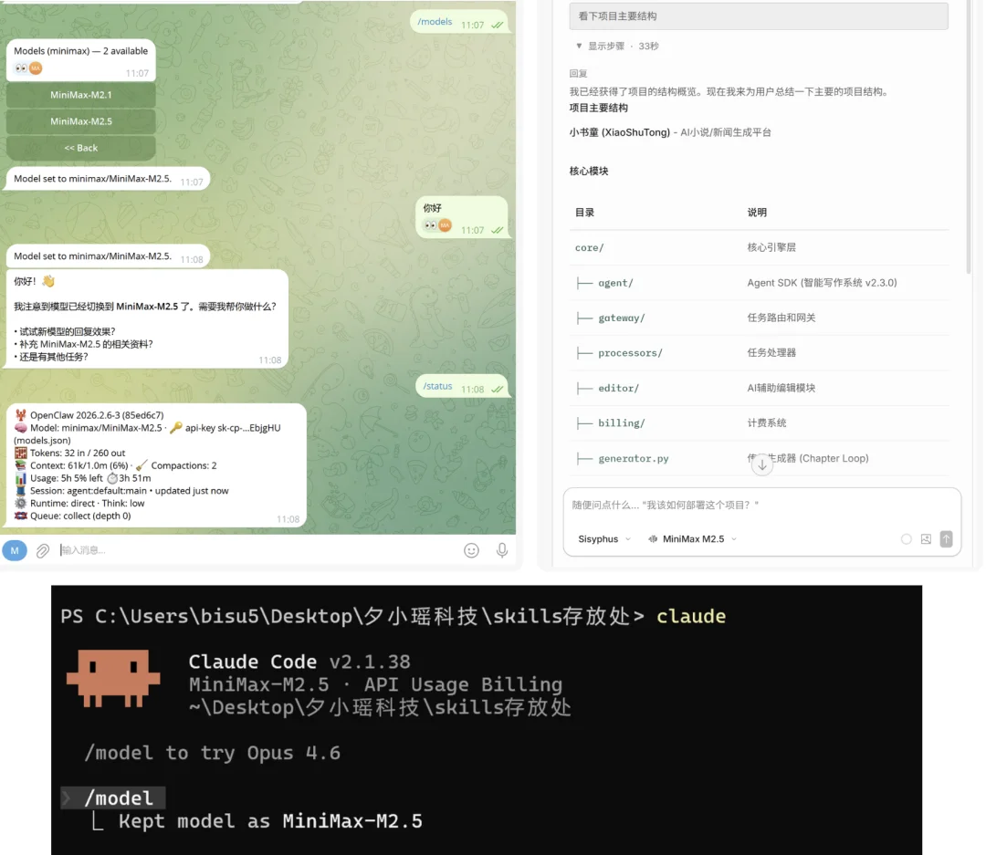 其中 OpenClaw 的表现最让我印象深刻:在 Telegram 里通过 OpenClaw 切换到 MiniMax-M2.5 后,直接就能正常对话。